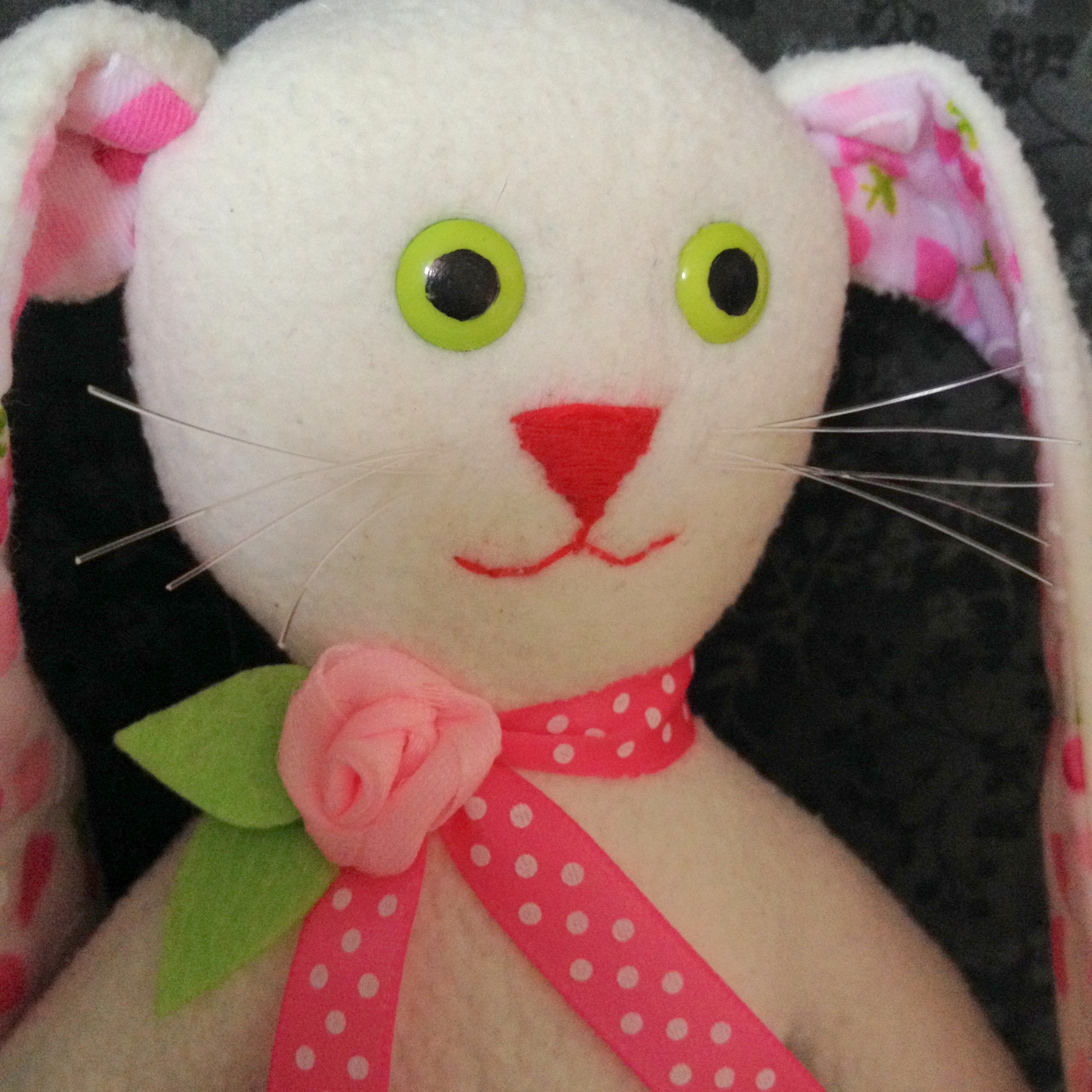 Белый флисовый зайка 21см ростиком с зелеными глазками и бантиком розочкой.