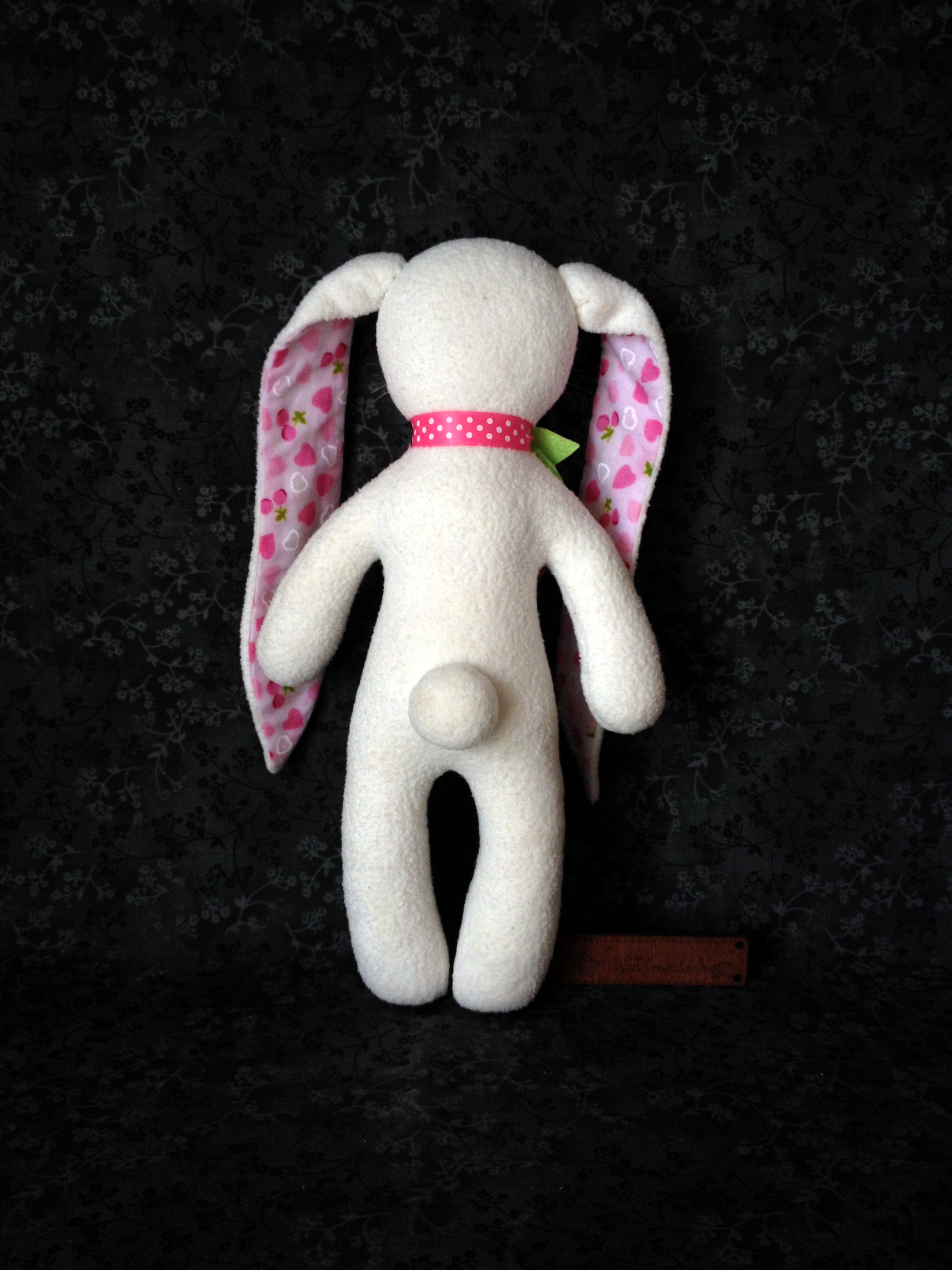 Белый флисовый зайка 21см ростиком с зелеными глазками и бантиком розочкой.