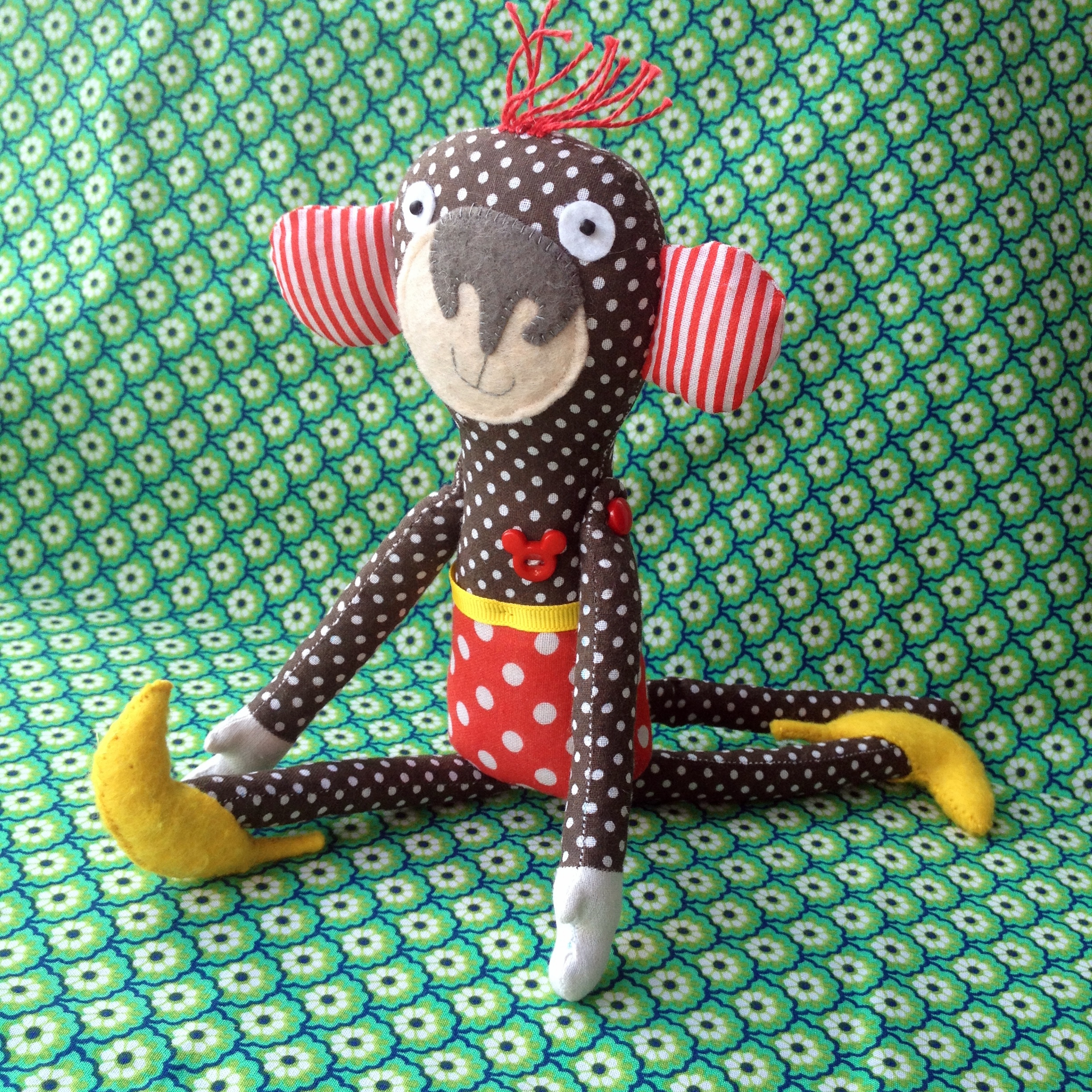 Она сшита из хлопка и фетра, поясок -репсовая лента. Малышка мечтает попасть в Диснейленд, поэтому пуговка МиккиМаус под сердцем))