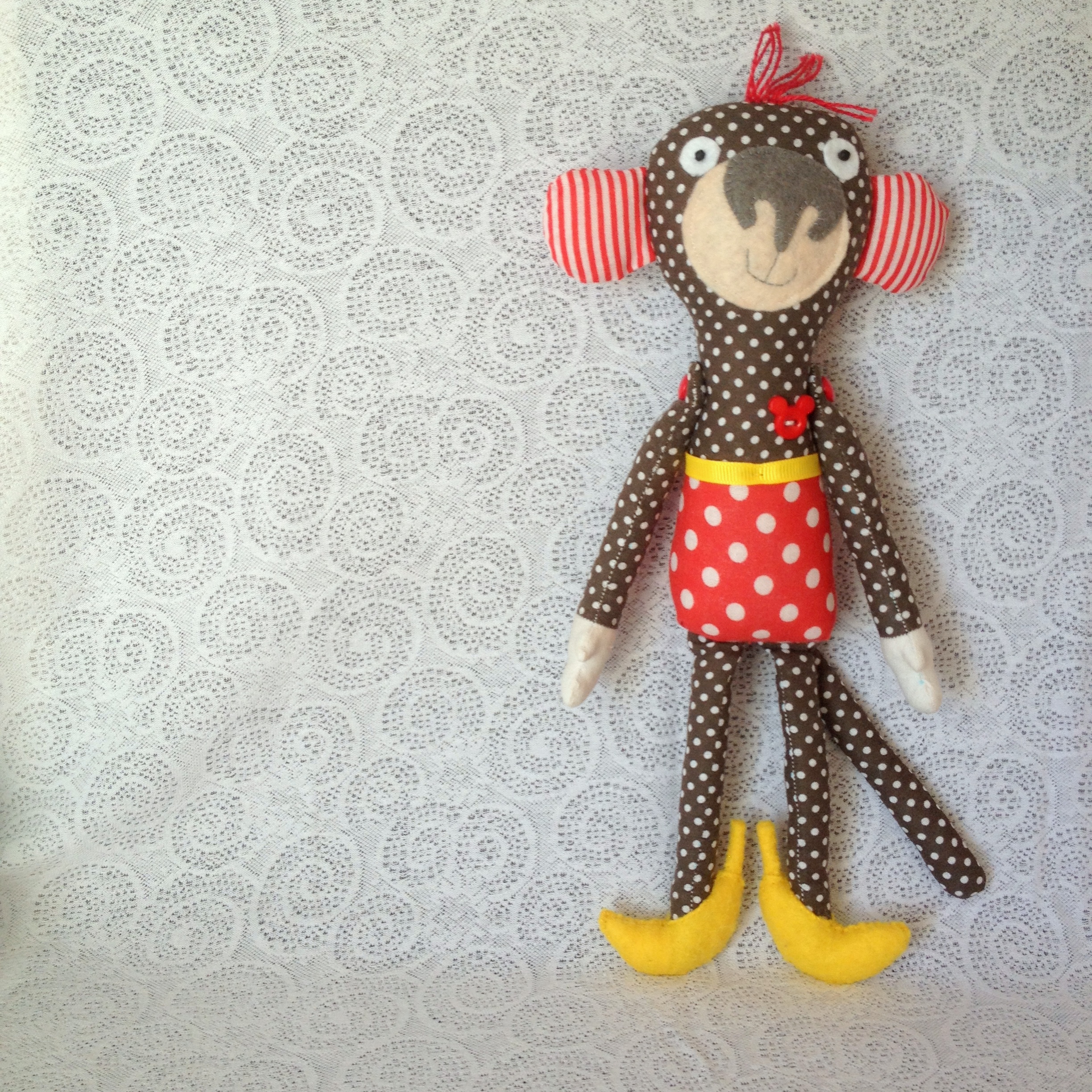 Она сшита из хлопка и фетра, поясок -репсовая лента. Малышка мечтает попасть в Диснейленд, поэтому пуговка МиккиМаус под сердцем))